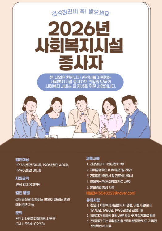 2026년 사회복지시설종사자 건강검진비 지원사업 안내 페이지 정보 작성자작성자 : 천사협 조회조회수 : 57회 작성일작성일 : 26-03-03 15:54 본문 2026년 사회복지시설종사자 건강검진비 지원사업 안내드립니다. 첨부파일 건강검진비 지원 신청서2026년 최신본.hwp (20.5K) 2회 다운로드 | DATE : 2026-03-03 15:54:09 목록 다음글2026년 예산서 공고 25.12.31