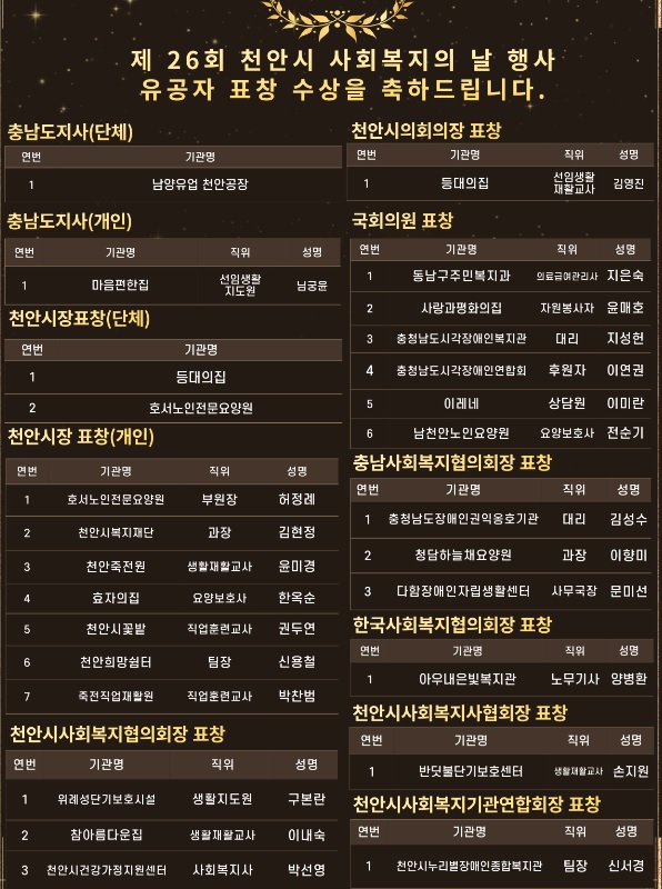 제 26회 천안시사회복지의 날 행사 유공자 표창수상 페이지 정보 작성자작성자 : 천사협 조회조회수 : 425회 작성일작성일 : 25-09-23 13:14 본문 수상을 축하 드립니다! 목록 다음글「제26회 천안시사회복지의 날 행사」사회복지 유공자 추천 협조 요청 25.07.28